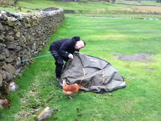 In contrast to yesterday however, the weather was simply lovely and the views literally breathtaking. We left Coniston at 9am and spent the next 7 hours ambling through beautiful countryside, over sun kissed Lakeland fells and through luscious green woodland, abloom with with wild garlic and bluebells-it was truly wonderful walking. We've just set up camp in a fantastic location, on farmland below Langdale Pikes-stunning. Unfortunately the rain has started again, but never mind we've just entered a convivial Inn called Wainwright's and intend to retire to a fine hot meal washed down my local Lakeland ale. Ain't life grand? Enjoy the photos.